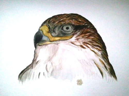 Due to the number of experiences I have had with Buteo regalis this winter, I thought it appropriate to take a break from packing today and paint a headshot of the fierce looking bird. Listening to music and enjoying the mood of the last snow storm I will endure for a time, I created this large portrait of what is now a very familiar bird. I have difficulty accomplishing my goals with watercolors, and this exercise was no different. Still I was pleased enough with the outcome to share. If the bird intrigues, please take the opportunity to easily see the bird as it occupies farmlands for winter. It truly is a regal as its name implies, and I will miss the regular interactions I have had with the bird. Still life goes on and there are others out in the wide world to find and know, and so I will go.