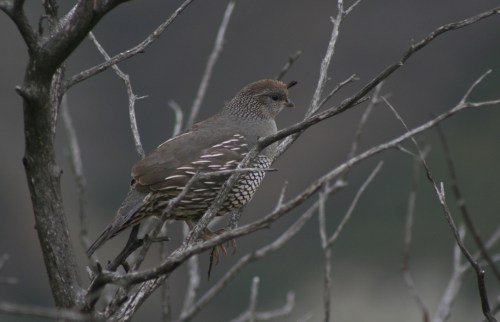 The birds of course were different than the now normal species I see in the desert. In the desert there are Gambel’s Quail, but once you climb out of the desert, the niche is filled by the California Quail. I saw many today, and was able to photograph one female sitting still on some dead and bare branches. I couldn’t help but notice the dull color scheme of the photo. With relatively low light, it seemed the scenes of the day were all very mellow. This photograph captures that mood precisely, gloomy but beautiful. I am often in awe at these type of images. Nature is master of color schemes only the most accomplished of artists know how to manage.