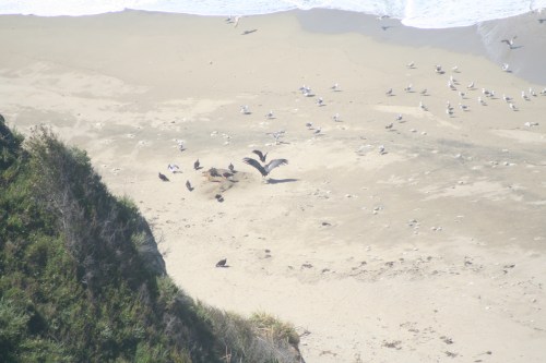 The two birds were very tolerant of me and my camera. I watched them as they sat preening, content with the passing cars and occasional passersby. After nearly an hour, one of the birds left the tree, soaring slow and strong towards the coast. Nearly five hundred feet below the road, the bird landed on the sand. Through my binoculars, I saw a number of birds gather around a large corpse. Gulls and Turkey Vultures yielded their meal to their superior. Every bird backed away as the condor fed upon a decaying elephant seal.