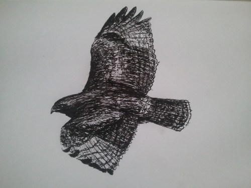 Dark morph Immature Red-tailed Hawk- Buteo Jamaicensis. Pen and ink on paper.