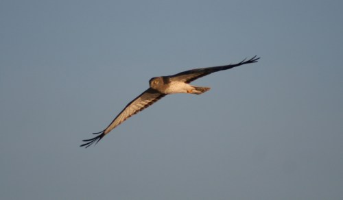 The Harrier is sexually dimorphic. The male is a ghostly grey above, white belly below, with black tipped wings and piercing yellow eyes. The female wears beautiful brown, with a heavily streaked belly. Juveniles resemble the female, differing with a brilliant orange belly. With long wings and tail, and distinctive flight and hunting behavior, the Harrier is among the easiest of the raptors to identify at a distance.