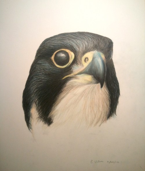 I have been meaning to illustrate this falcon for some time. Today I decided that given last weeks experience, I ought to put forth the energy towards illustrating that distinctive face that left me puzzled and surprised. The bird was very far away, so I couldn’t use my camera get a decent photo. I did make an attempt to use the scope and my phone to get a photo. Certainly there is no mistaking it. The bird was not a Prairie Falcon, a bird that frequents the area I was in. I cropped the photo substantially to make sure the bird was shown clearly.